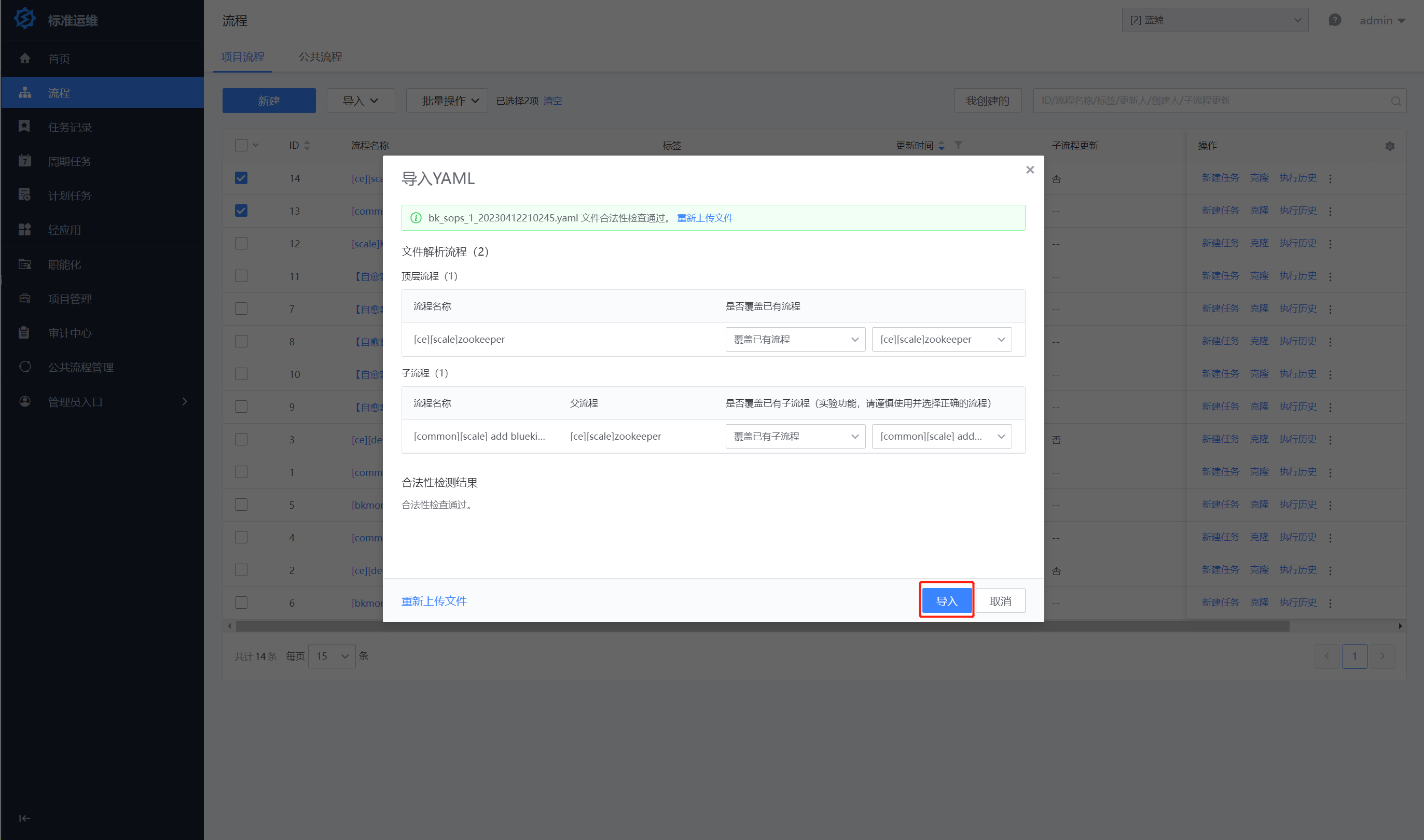 详细步骤:打开标准运维 -> 流程 -> 项目流程 -> 导入YAML -> 点击上传 -> 导入