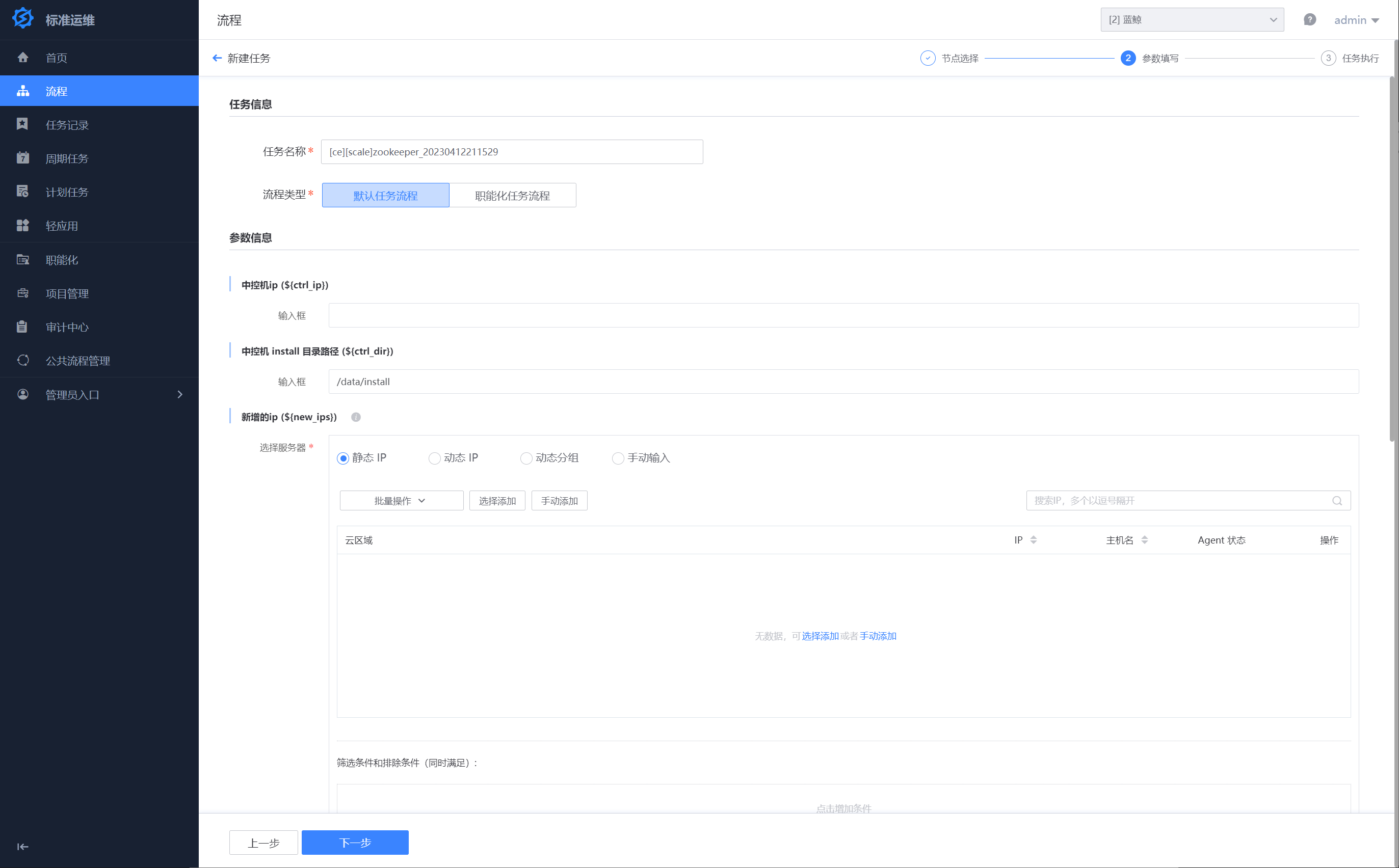 - 选择流程 “[ce][scale]kafka” 流程模版进行新建任务,根据提示填写相关信息。确认填写信息无误后,开始执行任务。